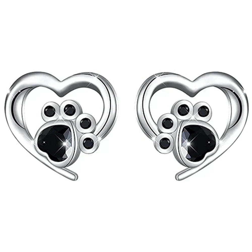 Ohrringe mit Herz und Pfote – Silberne Ohrringe mit schwarzem Kristall